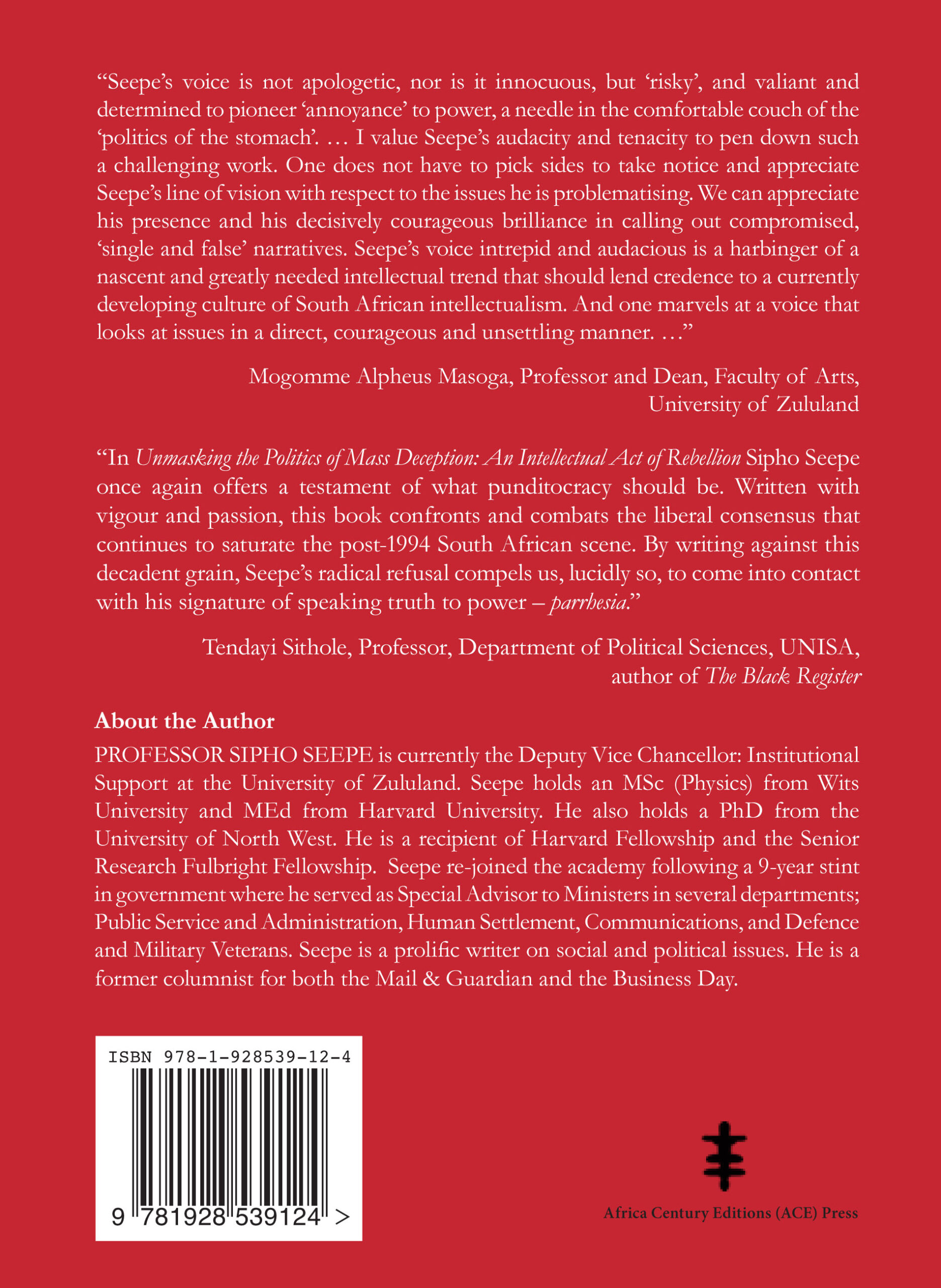 “In Unmasking the Politics of Mass Deception: An Intellectual Act of Rebellion Sipho Seepe once again offers a testament of what punditocracy should be. Written with vigour and passion, this book confronts and combats the liberal consensus that continues to saturate the post-1994 South African scene. By writing against this decadent grain, Seepe’s radical refusal compels us, lucidly so, to come into contact with his signature of speaking truth to power – parrhesia.”